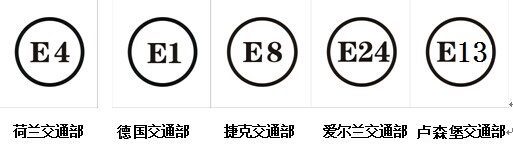 E1—德国 E2—法国 E3—意大利 E4—荷兰 E5—瑞典 E6—比利时 E7—匈牙利 E8—捷克 E9—西班牙 E10—南斯拉夫 E11—英国 E12—奥地利 E13—卢森堡 E14—瑞士 E16—挪威 E17—芬兰 E18—丹麦 E19—罗马尼亚 E20—波兰 E21—葡萄牙 E22—俄罗斯 E23—希腊 E24—爱尔兰 E25—克罗地亚 E26—斯洛文尼亚 E27—斯洛伐克 E28—白俄罗斯 E29—爱沙尼亚 E31—波黑 E37—土耳其。